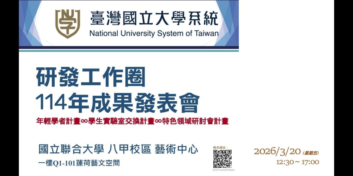 「臺灣國立大學系統研發工作圈114年成果發表會」活動資訊如下:l活動時間:115年3月20日(星期五)13:00-17:00。l活動地點:國立聯合大學八甲校區 藝術中心。l報名連結:https://