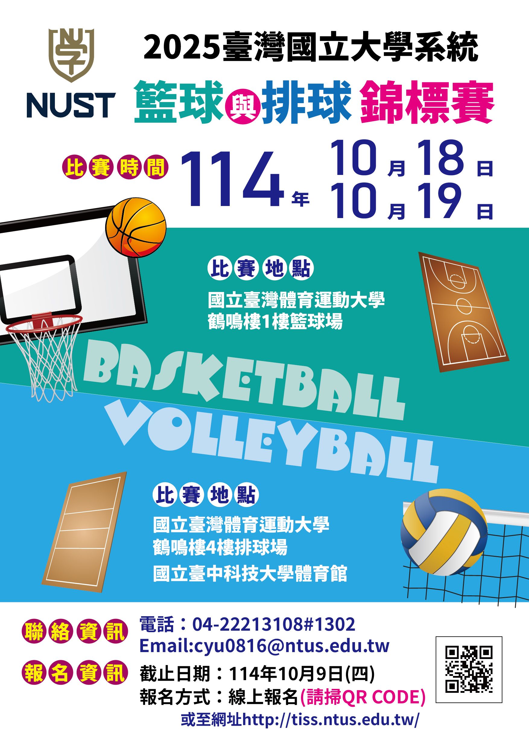 【NUST體育工作圈】2025臺灣國立大學系統籃球與排球錦標賽開始報名囉!即日起至10/9止