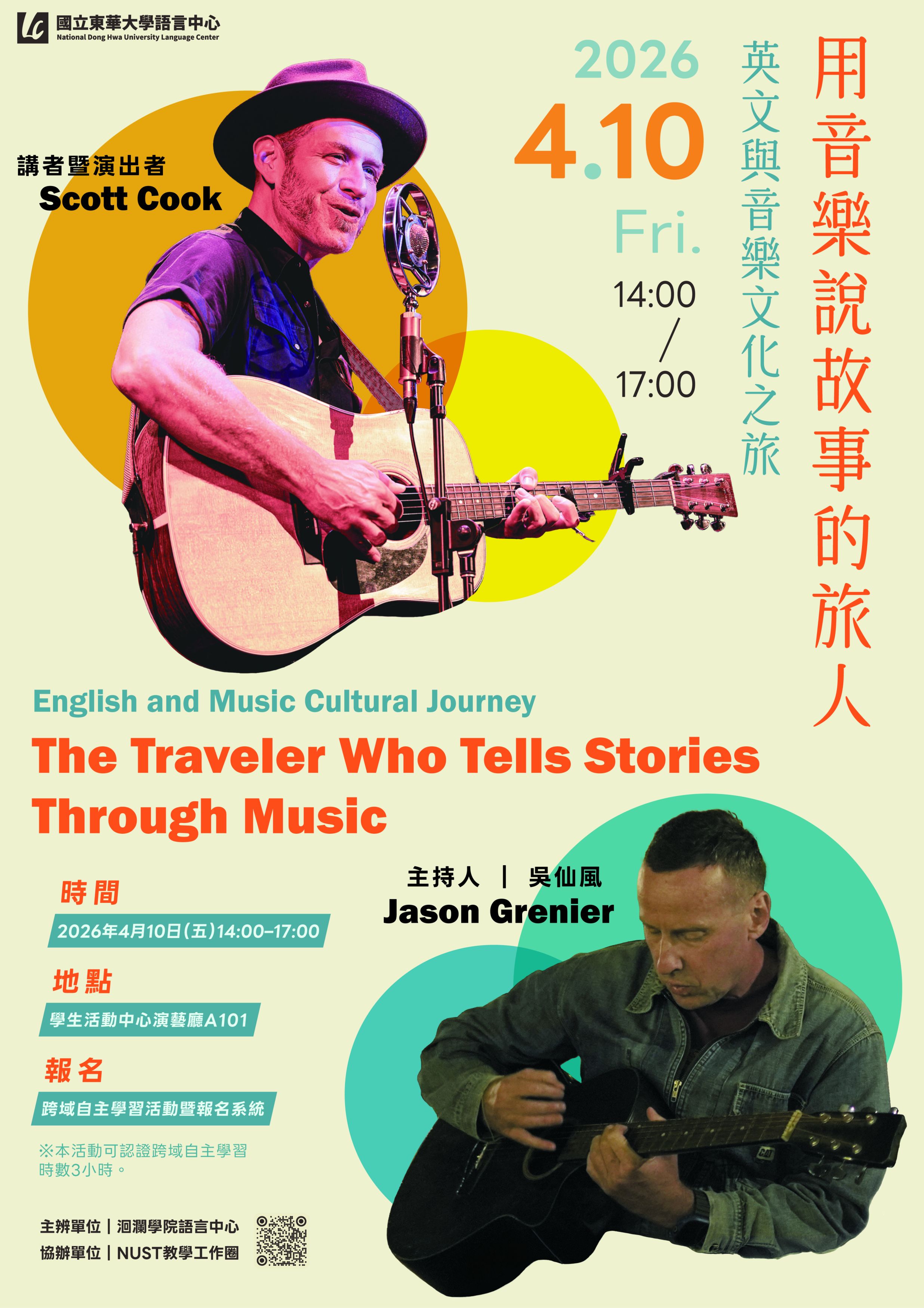 Jason Grenier 吳仙風, a faculty member at the Language Center of National Dong Hwa University, is also a well-known figure in Taiwan’s independent music scene. Marking over two decades of songwriting, he released his latest album As You Were on December 20, 2025, now available on major streaming platforms. His works trace the emotional landscape of life’s transitions—capturing memories, growth, and loss through honest melodies and reflective lyrics.