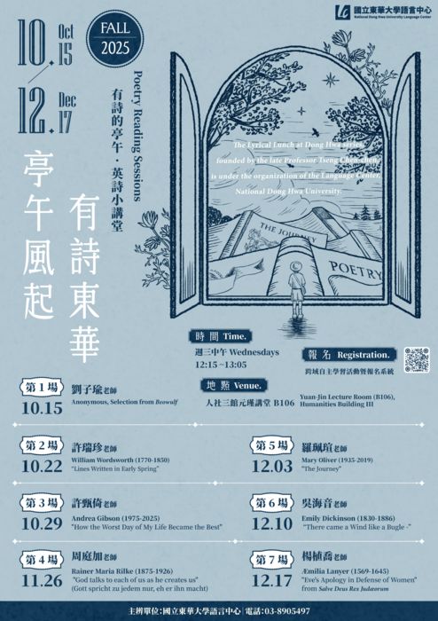 語言中心本學期的「有詩的亭午」系列活動,規劃了共7場「英詩小講堂Poetry Readings」。由語言中心劉子瑜、許瑞珍、周庭加3位老師,以及特邀英美系楊植喬老師與許甄倚老師、自資系吳海音老師,還有慈濟大學外語教學中心主任羅珮瑄老師等4位客席主講人,分享及介紹精彩動人、細膩絕妙的經典和當代英文詩歌。歡迎喜愛詩歌的您,一同相約東華美麗校園,於星期三中午來感受詩歌的多元生命力、閱讀文學作品的美好與豐盛!