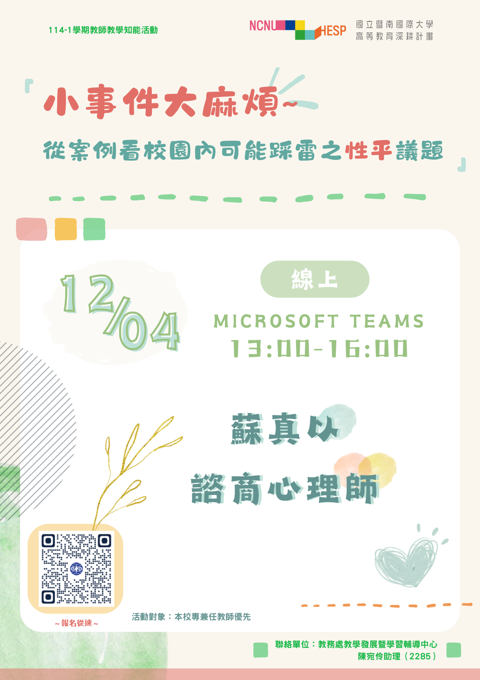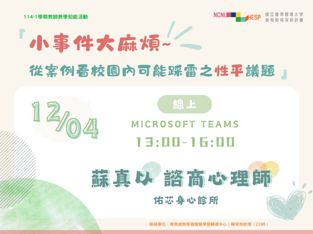 🧩演講主題:小事件大麻煩~從案例看校園內可能踩雷之性平議題