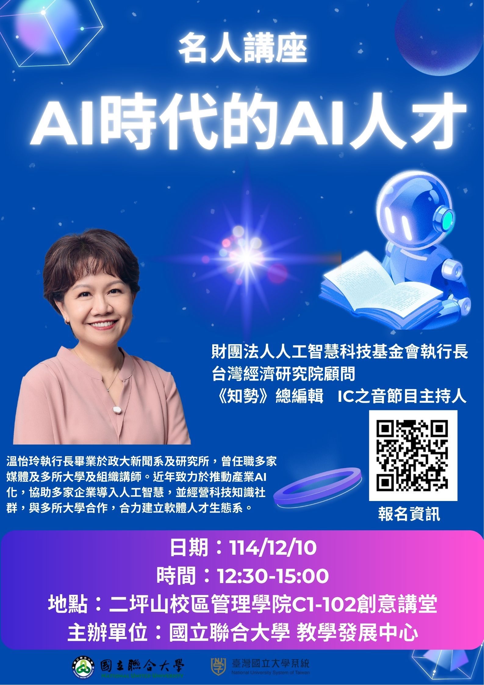 【國立聯合大學】114/12/10(三)名人講座:「AI時代的AI人才」