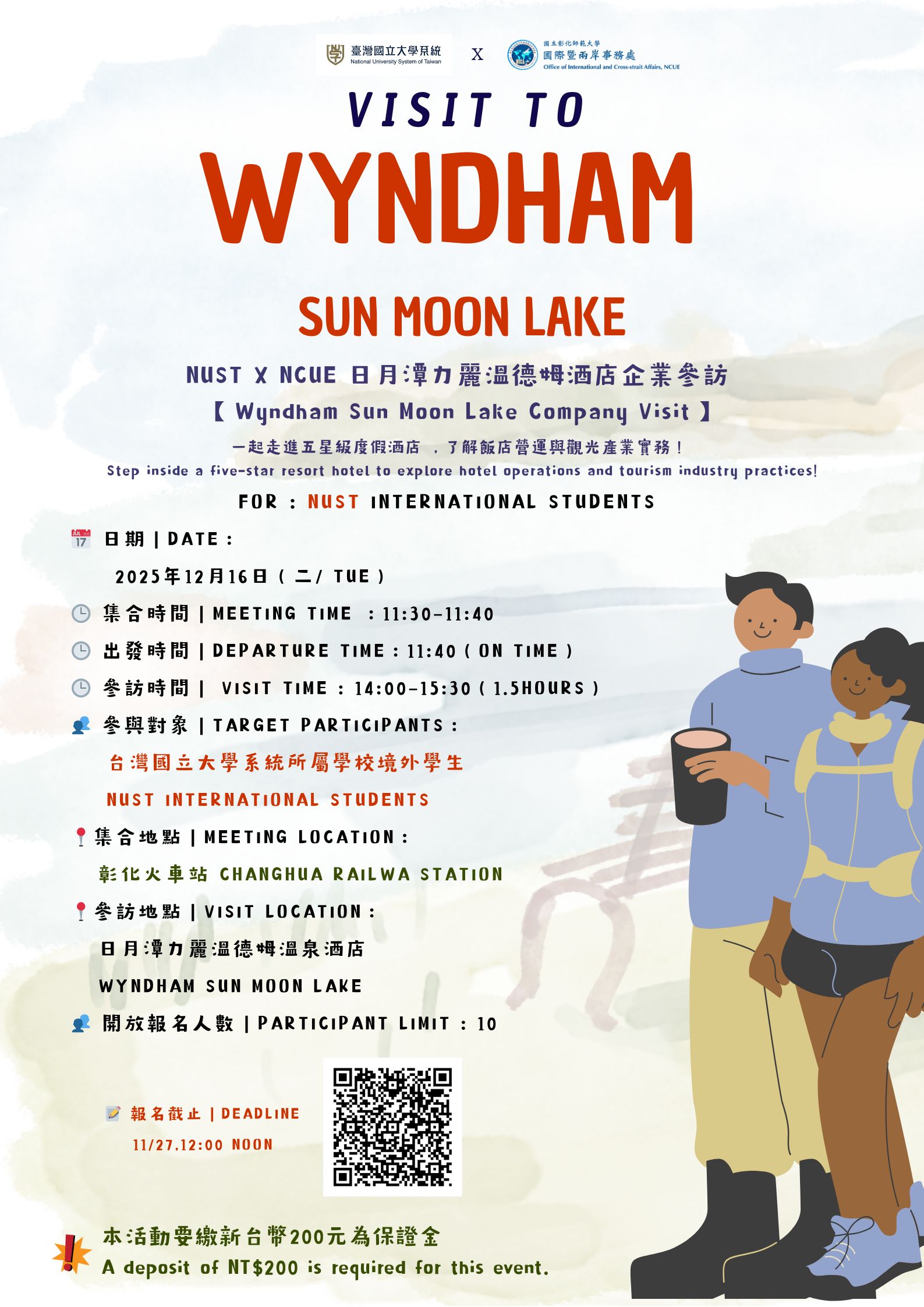 費用|行程免費,但需先繳交200元保證金,若當天活動未全程參與者,此保證金將不退回。請於2025/11/27中午12:00 前完成繳費才算完成報名流程。報名取消期限為2025/11/30 下午4:30 ,逾期不受理退費。