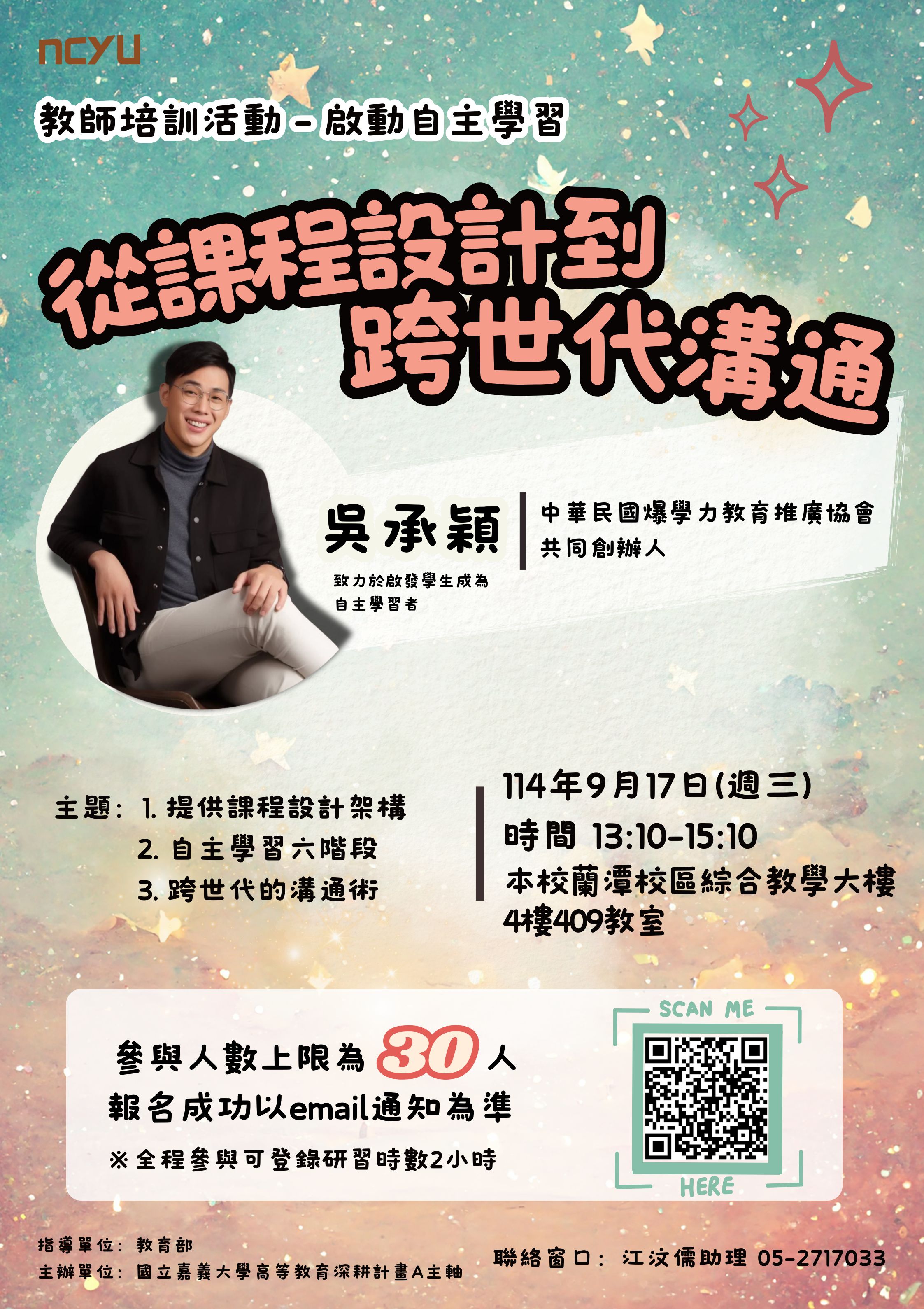 【國立嘉義大學】114/9/17(三)「啟動自主學習:從課程設計到跨世代溝通」工作坊!